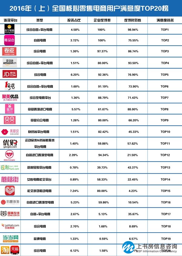 此外,根據(jù)報(bào)告,2016年上半年淘寶網(wǎng)/天貓(C2C集市賣家及品牌賣家)、當(dāng)當(dāng)網(wǎng)、樂視商城、國(guó)美在線、豐趣海淘、拼多多商城、蘑菇街、返利網(wǎng)、網(wǎng)易考拉海購(gòu)、優(yōu)購(gòu)網(wǎng)為2016上半年全國(guó)投訴率最高的前二十大零售電商后十位。而蘇寧易購(gòu)、唯品會(huì)、卷皮網(wǎng)、亞馬遜中國(guó)、京東、1號(hào)店、聚美優(yōu)品、蜜芽、貝貝網(wǎng)、美麗說十家主流網(wǎng)絡(luò)零售商位居“2016年(上)用戶滿意度TOP10零售電商”。