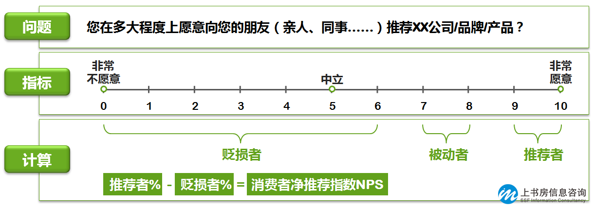 請用戶回答“您在多大程度上愿意向您的朋友(親人、同事……)推薦XX公司/產(chǎn)品?”根據(jù)用戶的推薦意愿,將用戶分為三類:推薦者(得分在9-10之間)、被動者(得分在7-8之間)、貶損者(得分在0-6之間)。