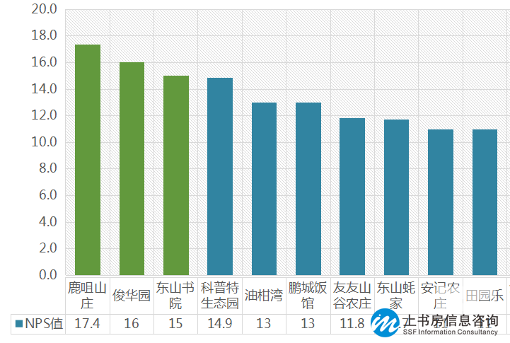 本次調(diào)查中,20個大鵬新區(qū)農(nóng)家樂品牌整體的平均凈推薦值為10.2分。排名第一的是鹿咀山莊,凈推薦值為17.4分;其次是俊華園,凈推薦值為16分;第三名是東山書院,凈推薦值為15分。