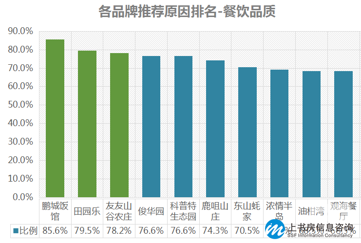 排名第一的是鵬城飯館,餐飲品質(zhì)推薦率為85.6%;其次是田園樂,推薦率為79.5%;第三名是友友山谷農(nóng)莊,推薦率為78.2%。