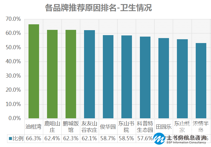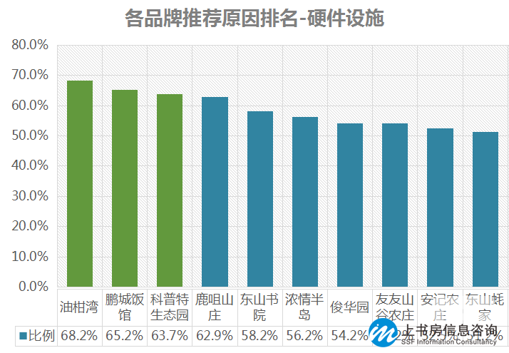 排名第一的是油柑灣,硬件設(shè)施推薦率為68.2%;其次是鵬城飯館,推薦率為65.2%;第三名是科普特生態(tài)園,推薦率為63.7%。