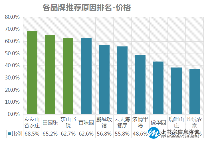 排名第一的是友友山谷農(nóng)莊,價格推薦率為68.5%;其次是田園樂,推薦率為65.2%;第三名是東山書院,推薦率為62.7%。