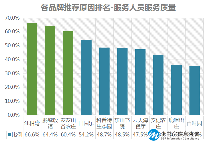 排名第一的是油柑灣,服務(wù)人員服務(wù)質(zhì)量推薦率為66.6%;其次是鵬城飯館,推薦率為64.4%;第三名是友友山谷農(nóng)莊,推薦率為60.4%。