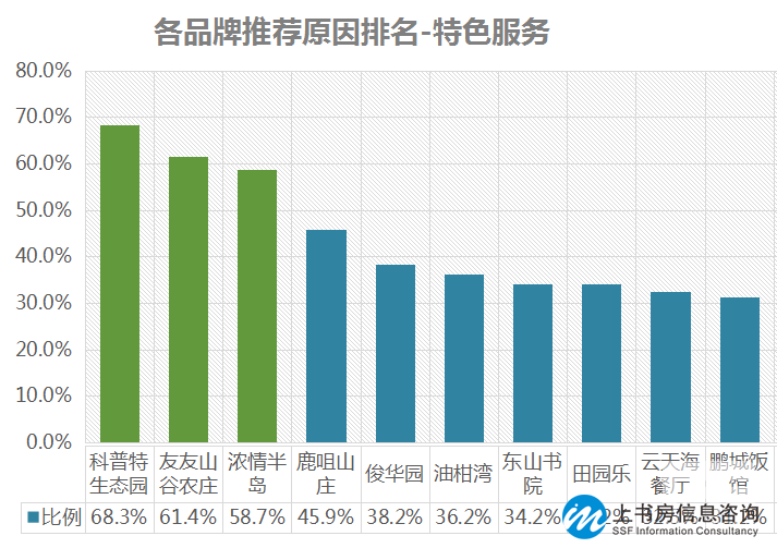 特色服務(wù)推薦率排名前三依次為:科普特生態(tài)園、友友山谷農(nóng)莊、濃情半島;