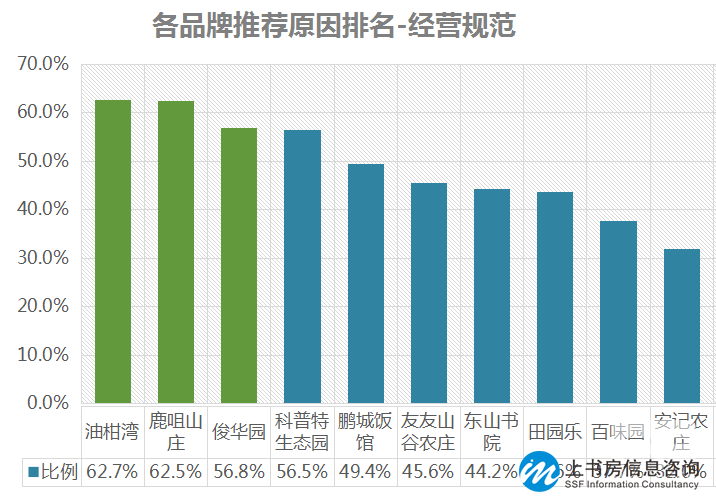 經(jīng)營規(guī)范推薦率排名前三依次為:油柑灣、鹿咀山莊、俊華園;