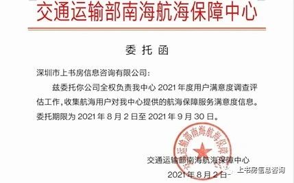 受交通運(yùn)輸部南海航海保障中心委托,上書(shū)房信息咨詢(xún)于2021年8月3日至2021年9月30日正式開(kāi)展交通運(yùn)輸部南海航海保障中心2021年度用戶(hù)滿(mǎn)意度調(diào)查評(píng)估項(xiàng)目。