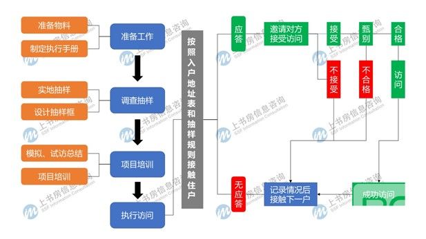 由于入戶訪問是通過訪問員上門與業(yè)主/租戶進行面對面訪問的調查方式,其操作難度遠大于其他物業(yè)滿意度調查方式,如電話調查、網絡調查等。因此,上書房信息咨詢對于入戶訪問整個流程把控也是決定入戶訪問項目成敗的關鍵。下面我們根據物業(yè)滿意度調查入戶訪問項目的各階段運作過程進行詳細介紹,幫助各位理解入戶訪問的重點和難點。