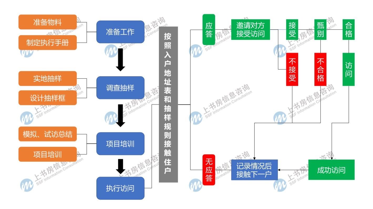 由于入戶訪問(wèn)是通過(guò)訪問(wèn)員上門與業(yè)主/租戶進(jìn)行面對(duì)面訪問(wèn)的調(diào)查方式,其操作難度遠(yuǎn)大于其他物業(yè)滿意度調(diào)查方式,如電話調(diào)查、網(wǎng)絡(luò)調(diào)查等。因此,上書房信息咨詢對(duì)于入戶訪問(wèn)整個(gè)流程把控也是決定入戶訪問(wèn)項(xiàng)目成敗的關(guān)鍵。下面我們根據(jù)物業(yè)滿意度調(diào)查入戶訪問(wèn)項(xiàng)目的各階段運(yùn)作過(guò)程進(jìn)行詳細(xì)介紹,幫助各位理解入戶訪問(wèn)的重點(diǎn)和難點(diǎn)。