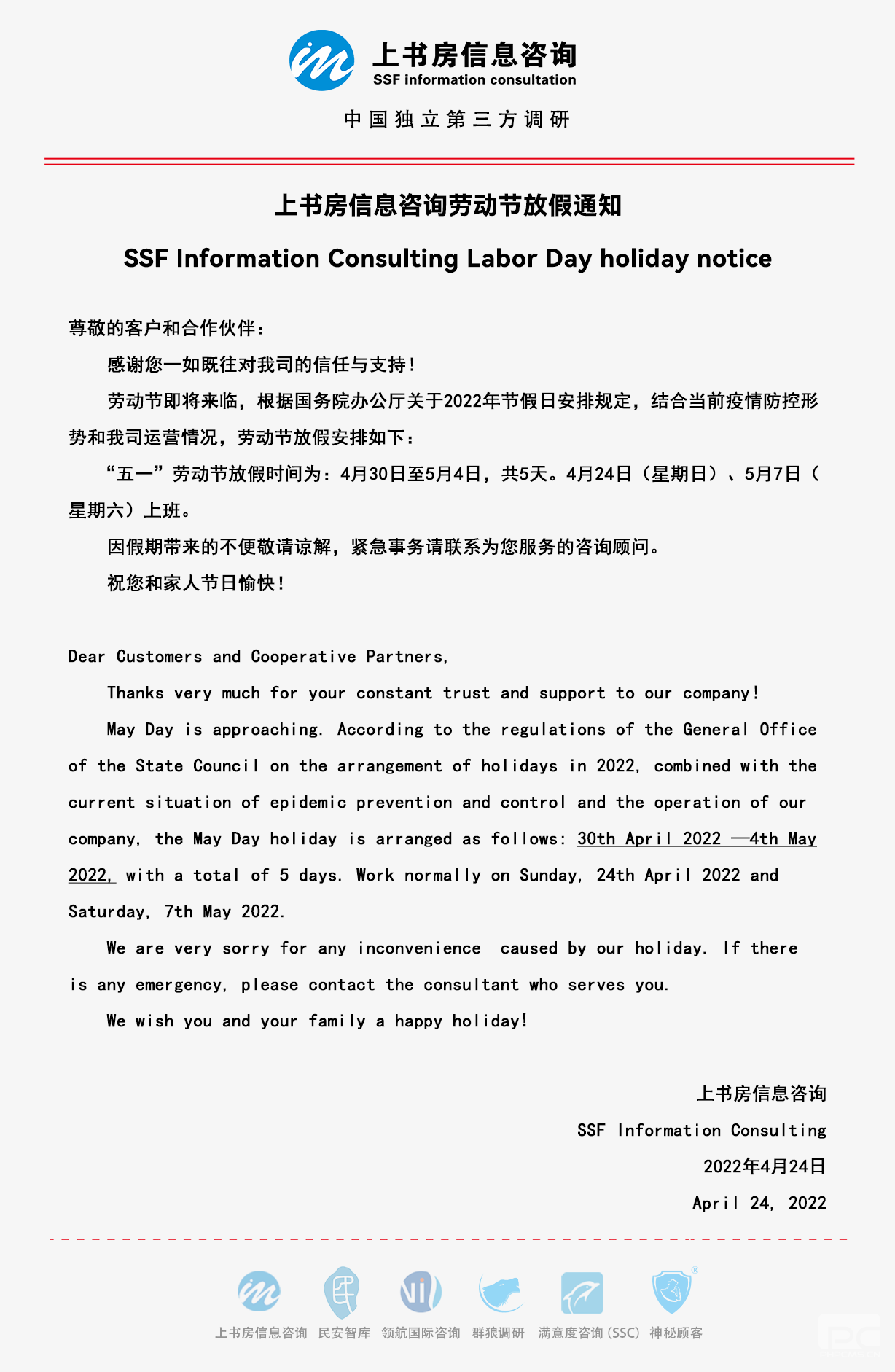 We are very sorry for any inconvenience caused by our holiday. If there is any emergency, please contact the consultant who serves you.