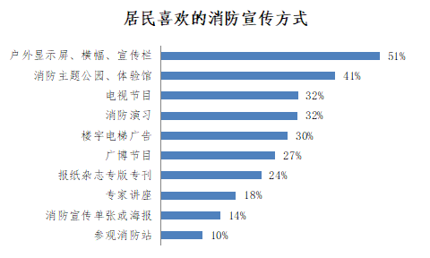 數據顯示,戶外顯示屏、橫幅、宣傳欄,消防主題公園、體驗館,電視節(jié)目成為市民心中消防宣傳方式TOP3,其中表達喜愛通過戶外顯示屏、橫幅、宣傳欄進行消防安全宣傳的市民比例為51%。通過這些形式進行消防宣傳活動,能極大提高市民接受消防安全科普的積極性。