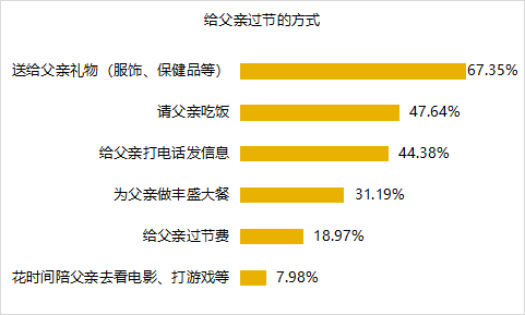 給父親過節(jié)最主要的方式就是送禮物(服飾、保健品等),占比67.35%;其次有大約一半的人請(qǐng)父親吃飯(47.64%)和打電話發(fā)信息(44.38%)。相較而言,年齡在31-40歲的人比其他年齡段更喜歡“給父親過節(jié)費(fèi)”。