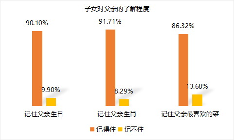 絕大部分的被訪者能夠記住父親的生日和生肖,占比分別為90.10%與91.71%。能記住父親最愛的菜的被訪者相對(duì)而言少了一些,占比為86.32%,不能記住父親最喜歡的菜的主要是男性、年齡為41-50歲、離異的人。