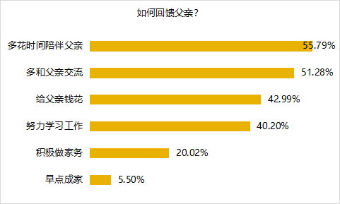 如何回饋父親,多數(shù)人(55.79%)的首要回答是“多花時(shí)間陪伴父親”,其次,超過一半(51.28%)的人選擇“多和父親交流”;給父親物質(zhì)回饋也是較為重要的回饋方式,選擇占比“給父親錢花”有42.99%,排名第三。