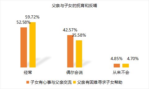 父親和子女之間存在和諧的依戀與反哺關(guān)系,絕大多數(shù)的人會(huì)和父親交流心事(95.15%),父親有困難會(huì)找子女幫忙(95.3%)