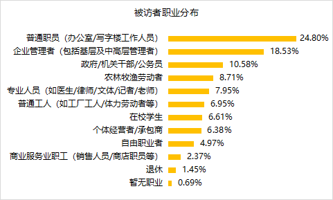 本次調(diào)查共回收2617份有效問卷,男性占比六成,年齡主要集中在18~40歲;已婚被訪者占六成,未婚占四分之一;主要以專科、本科和高中學(xué)歷為主(90%以上);主要職業(yè)為普通職員、企業(yè)管理者和政府/機(jī)關(guān)干部/公務(wù)員,詳細(xì)占比見文后。