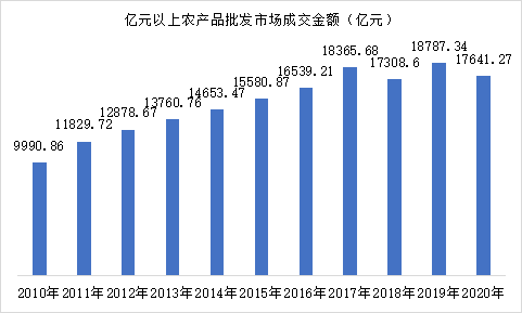 在批發(fā)市場成交金額方面來看,2010-2017年我國農(nóng)產(chǎn)品批發(fā)市場規(guī)模呈現(xiàn)平穩(wěn)擴大態(tài)勢,2017年我國億元以上農(nóng)產(chǎn)品批發(fā)市場的總成交額達(dá)到 18365.7 億元,2018年出現(xiàn)近年來首次下降, 2019年與2020年成交額較為震蕩,分別為18787.34億元和17641.27億元。