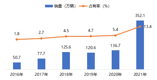 自2016年起,我國新能源汽車銷售數(shù)量逐步提升,2021年增長最高,銷量占有率均翻一番。