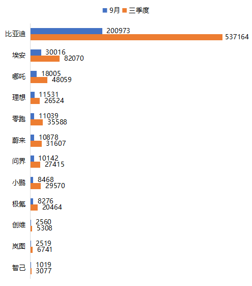 國內(nèi)各主流新能源車企發(fā)布的銷量成績看,比亞迪以絕對(duì)優(yōu)勢領(lǐng)先,9月銷量200973量,單月銷量超過20萬輛。其次是廣汽埃安,9月銷量達(dá)到30016量。