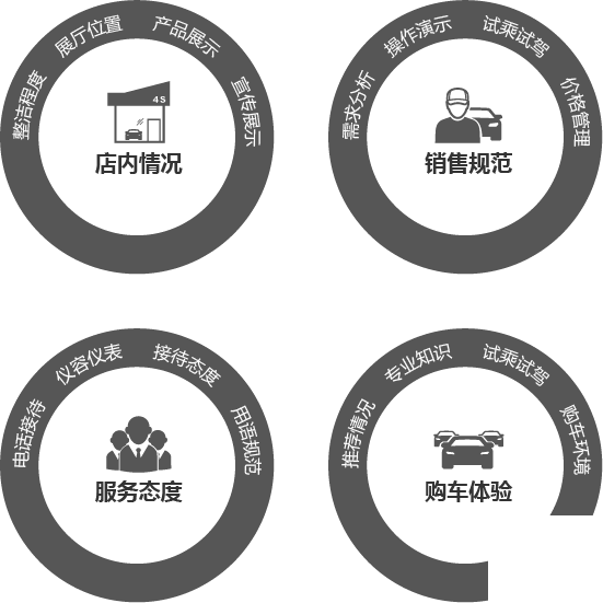 基于上述檢測售后服務(wù)檢測內(nèi)容,不同品牌的神秘顧客檢測會根據(jù)自身品牌要求,設(shè)置不同的檢測考察標(biāo)準(zhǔn)。深圳神秘顧客(SMS)是專業(yè)通過神秘顧客方式來了解4S店的銷售服務(wù)、銷售價格等方面管理情況。從廳外環(huán)境→廳內(nèi)設(shè)施→宣傳信息→進(jìn)店問候/接待→儀容儀表→服務(wù)態(tài)度→產(chǎn)品講解和咨詢→解答客戶咨詢→離店回訪等方面設(shè)計檢測指標(biāo),并通過錄像錄音方式進(jìn)行檢測,保證全流程有據(jù)可查。