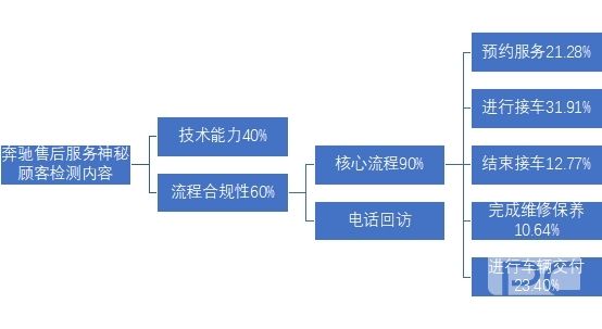 奔馳售后服務(wù)的神秘顧客調(diào)研的考察內(nèi)容主要分為兩部分:技術(shù)能力和流程合規(guī)性。其中技術(shù)能力占總體得分的 40%,流程合規(guī)性占 60%;在流程合規(guī)性方面,核心流程占比90%,電話回訪占比10%;在核心流程方面,分別考核預(yù)約服務(wù)、進(jìn)行接車、結(jié)束接車、完成維修保養(yǎng)和進(jìn)行車輛交付等5大流程環(huán)節(jié),分別占比21.28%,31.91%,12.77%,10.64%和23.40%。