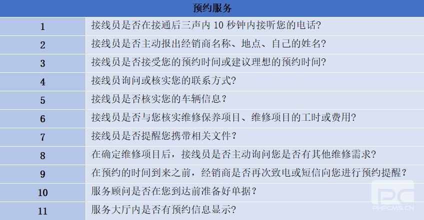 在深圳神秘顧客市場調(diào)查有限公司的對某汽車品牌的神秘顧客檢測項目中,根據(jù)檢測方提供的日常作業(yè)標(biāo)準(zhǔn),制定了一套詳細(xì)的暗訪檢測標(biāo)準(zhǔn),以下展示的是“預(yù)約服務(wù)”的考察標(biāo)準(zhǔn)。