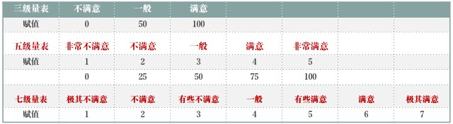 需要注意的是,不同等級的李克特量表應用范圍不同。例如,物業(yè)滿意度調查就不適合用3級或者5級量表,容易出現(xiàn)滿分較多的情況,為了有所區(qū)分,拉大差異度,往往會使用用到7級或10級量表。