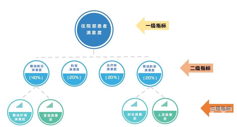 量表指標(biāo)來源于相關(guān)學(xué)科的研究結(jié)論,并通過一套由不同指標(biāo)組成的嚴(yán)格模型來計(jì)算而成。例如,在醫(yī)院住院患者滿意度調(diào)查中,上書房信息咨詢通過構(gòu)建指標(biāo),使用5級態(tài)度量表,即“很滿意、滿意、一般、不滿意、很不滿意”,并賦予“5,4,3,2,1”的值(或相反順序),來完成指標(biāo)的量化。根據(jù)每項(xiàng)指標(biāo)在測評體系中的重要性不同,賦予不同指標(biāo)以不同的權(quán)數(shù)。加權(quán)方法除了主觀賦權(quán)法以外,有直接比較法、對偶比較法等,最后的客戶滿意度則來自于對各層指標(biāo)的加權(quán)計(jì)算。具體而言,住院部患者滿意度的計(jì)算方法公式為:(整體情況滿意度X40%)+(科室滿意度X20%)+(治療室滿意度X20%)+(醫(yī)技科室滿意度X20%)。