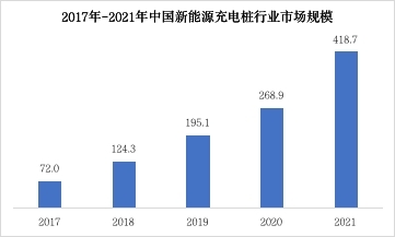 由于國內(nèi)充電設(shè)備制造行業(yè)的技術(shù)門檻較低,產(chǎn)品同質(zhì)化程度較高,國內(nèi)充電樁設(shè)備生產(chǎn)領(lǐng)域的相關(guān)公司數(shù)量超過400家,供應(yīng)商數(shù)量多,市場競爭大。不過充電樁產(chǎn)業(yè)鏈上游的制造企業(yè)頭部效應(yīng)明顯,龍頭企業(yè)集中度較高。根據(jù)中國電動汽車充電基礎(chǔ)設(shè)施促進聯(lián)盟數(shù)據(jù),2017年我國充電樁市場規(guī)模為72億元,到2021年達到418.7億元,復(fù)合年均增長率高達42.2%。