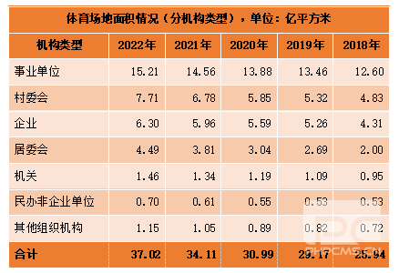 2022年全國(guó)體育場(chǎng)地422.68萬(wàn)個(gè),體育場(chǎng)地面積37.02億平方米,人均體育場(chǎng)地面積2.62平方米。不同機(jī)構(gòu)體育場(chǎng)地面積近年增長(zhǎng)最快的是居委會(huì)的,每年增長(zhǎng)率均在13%以上,其次是村委會(huì)、機(jī)關(guān)和其他組織機(jī)構(gòu)的;不同運(yùn)動(dòng)項(xiàng)目場(chǎng)地?cái)?shù)量近年來(lái)增長(zhǎng)最快的是健身步道,每年增長(zhǎng)率在16%以上,其次是健身房、游泳場(chǎng)地和足球場(chǎng)地。