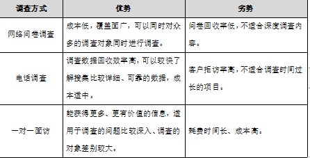 網(wǎng)絡(luò)問(wèn)卷調(diào)查、電話調(diào)查、一對(duì)一面訪。各種調(diào)查方式優(yōu)劣勢(shì)如下: