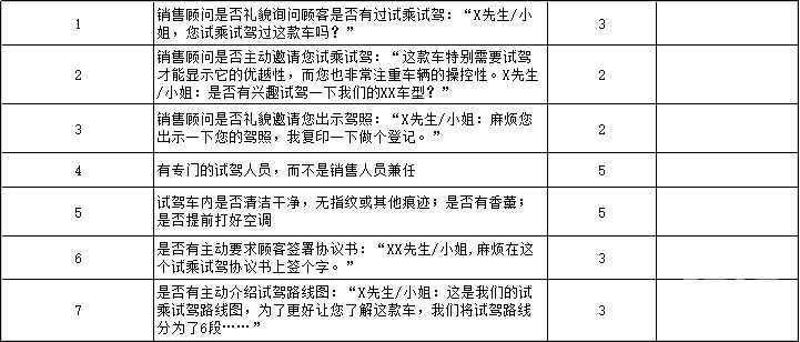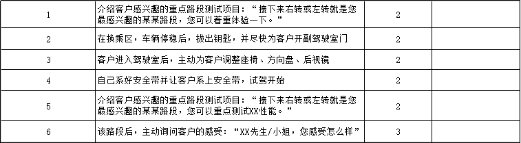 試駕結(jié)束后,并不代表服務(wù)就結(jié)束了,神秘顧客會考察后續(xù)的服務(wù)仔細(xì)程度,比如是否幫開車門、幫開展廳門、后續(xù)洽談是否有及時提供飲品等。