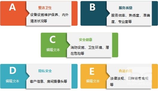 在硬件方面,酒店的基礎(chǔ)設(shè)施完善程度和規(guī)模影響著酒店自身的綜合接待能力;在軟件方面,顧客對酒店感知服務(wù)質(zhì)量是酒店是否具有吸引力重要因素之一。在這兩方面之內(nèi),可以細化分出五個部分的調(diào)查內(nèi)容:整潔衛(wèi)生、服務(wù)質(zhì)量、安全健康、隱私安全、合法合規(guī)。